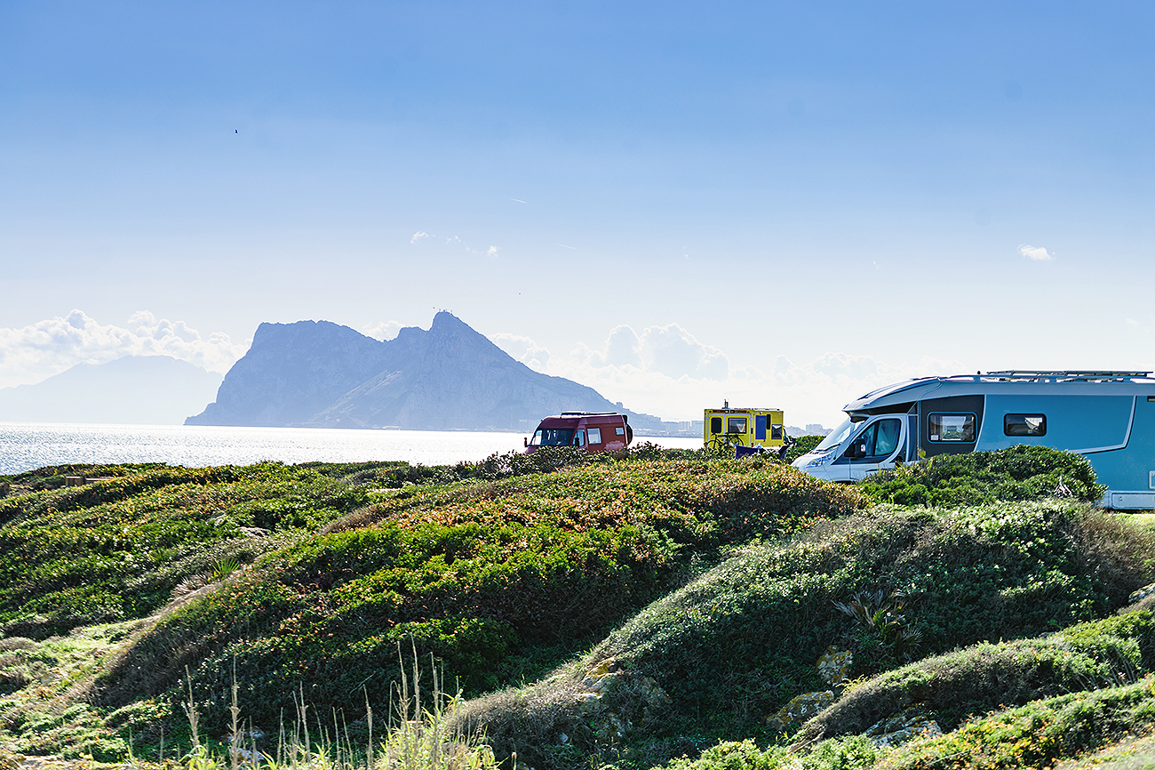 El coronavirus ha impulsado al turismo en autocaravana, opcin que gana ms adeptos entre todo tipo de pblico, no slo entre los habituales turistas procedentes de Francia y Alemania, donde existe una larga tradicin de viajar con la casa a cuestas. Desde la desembocadura del Mio, hasta el litoral Atlntico, pasando por las costas Cantbrica y Brava, en Espaa hay interesantes destinos en los que los ms nmadas podrn comer bien y ver puestas de sol, mientras hacen turismo y contactan ms directamente con una rica naturaleza. En la imagen, caravanas frente al Pen de Gibraltar, por si decides llegar a uno de los lmites de la Pennsula, por el sur.