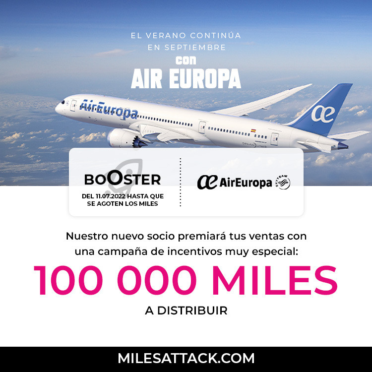 La compañía aérea española inicia hoy su colaboración con el programa lanzando una campaña especial de incentivos para recompensar a los agentes de viajes con MILES (puntos regalo) por las ventas de billetes de larga distancia realizados a partir del 11 de julio y con fecha de salida a partir del 15 de septiembre del 2022. Air Europa ofrecerá para esta campaña 100 000 MILES: 200 MILES por billete de ida y vuelta en clase turista y 500 MILES en clase enterprise.