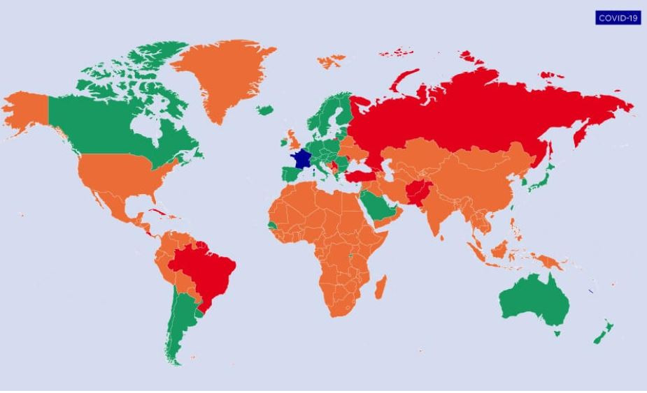 Al actualizar los mapas codificados por colores, Francia también eliminó un país de la lista roja, Irán (pasó a amarillo), y no agregó ningún otro. Hasta la fecha, la lista roja consta de los siguientes países: Afganistán, Brasil, Costa Rica, Cuba, Georgia, Moldavia, Montenegro, Pakistán, Rusia, Serbia, Surinam y Turquía.