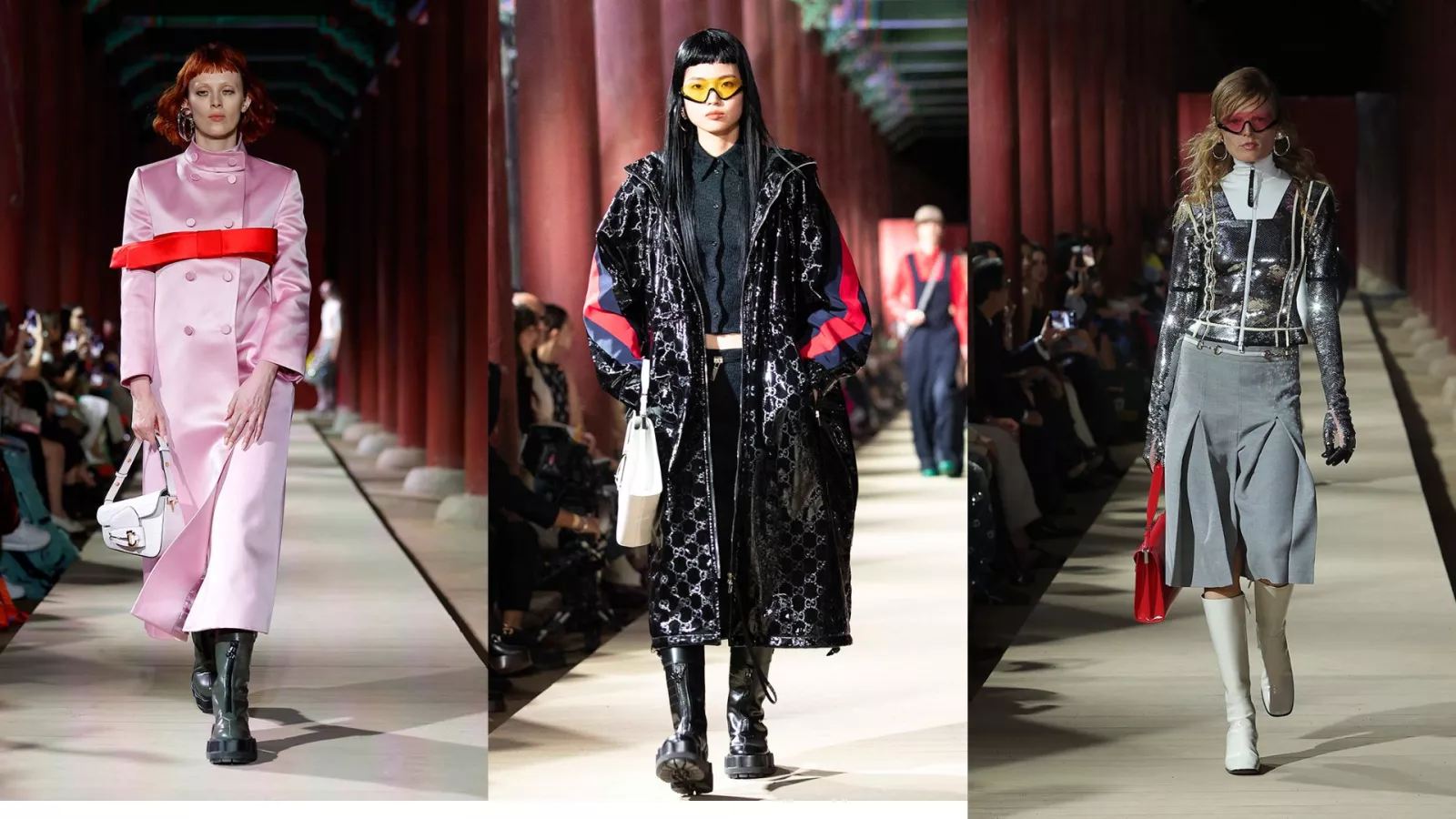 Pero el equipo de diseño de Gucci no se conforma con su reinterpretación moderna de la tradición surcoreana. Quiere más. Y en su afán de ser más Gucci que Gucci, revuelve sus diseños más noventosos para sumar neopreno, glamour, deconstrucción y líneas deportivas que remiten al surf y al skeate.
