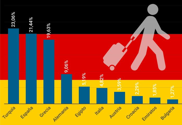 De acuerdo con los datos consolidados hasta el 9 de agosto, Turquía lideraba las reservas de viajes realizadas en el mercado emisor alemán para irse de vacaciones en 2021, con una cuota de mercado del 23%, por delante de España (21,4%), Grecia (19,6%) y la propia Alemania (9%).