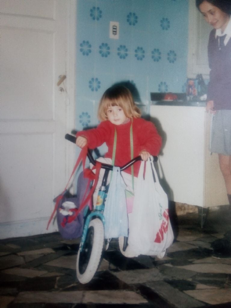Se entretenía llenando bolsas con juguetes y trapos, luego enganchaba un paquete a cada lado del manubrio y así daba vueltas por la cocina. El circuito era un espacio vacío de un metro y medio, entre la mesa y el televisor.