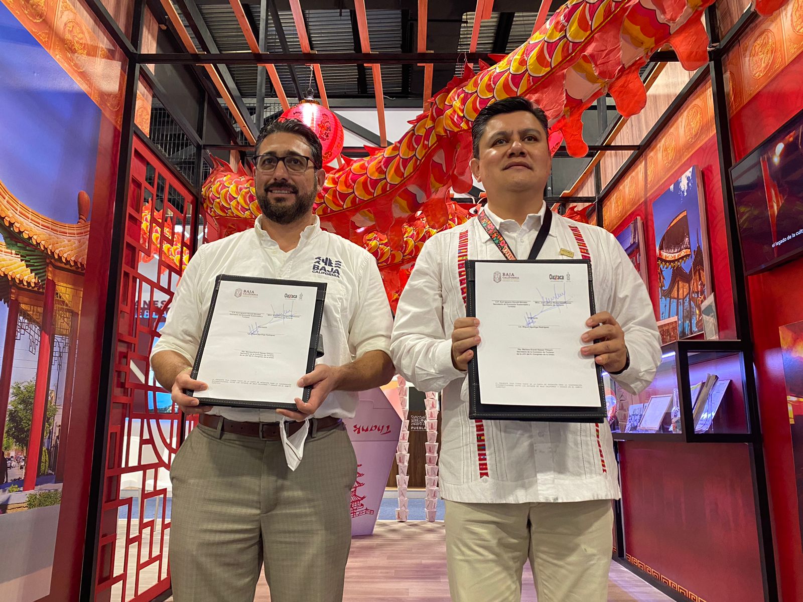 En dos ceremonias realizadas en stand de Baja California y Oaxaca, en las instalaciones del Centro de convenciones Yucatán Siglo XXI, se dieron cita el Secretario de Turismo del Gobierno del Estado de Oaxaca, Juan Carlos Rivera Castellanos y el Secretario designado de la Secretaría de Turismo del Estado de Baja California, Lic. Miguel Aguíñiga Rodríguez; junto a diversos representantes de ambas delegaciones para celebrar el acuerdo.