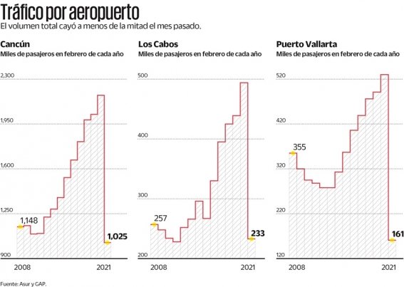 Este destino reportó el peor comportamiento el mes pasado, cuyo aeropuerto atendió a sólo 161 mil pasajeros, es decir, menos de un tercio que hace un año y significó su peor febrero desde que hay información mensual disponible, a partir de 2006.