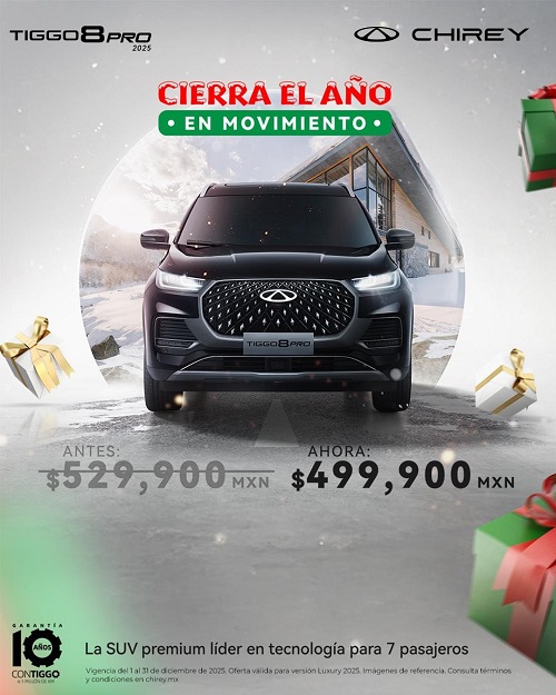 Como parte de su campaña de diciembre, Chirey ofrece beneficios especiales para cerrar el año: TIGGO 8 PRO 2025 cuenta con un descuento directo de 30,000 pesos, pasando de 529,900 a 499,900 pesos, lo que permite acceder a un SUV de enfoque familiar y alto nivel de equipamiento a un precio más accesible.