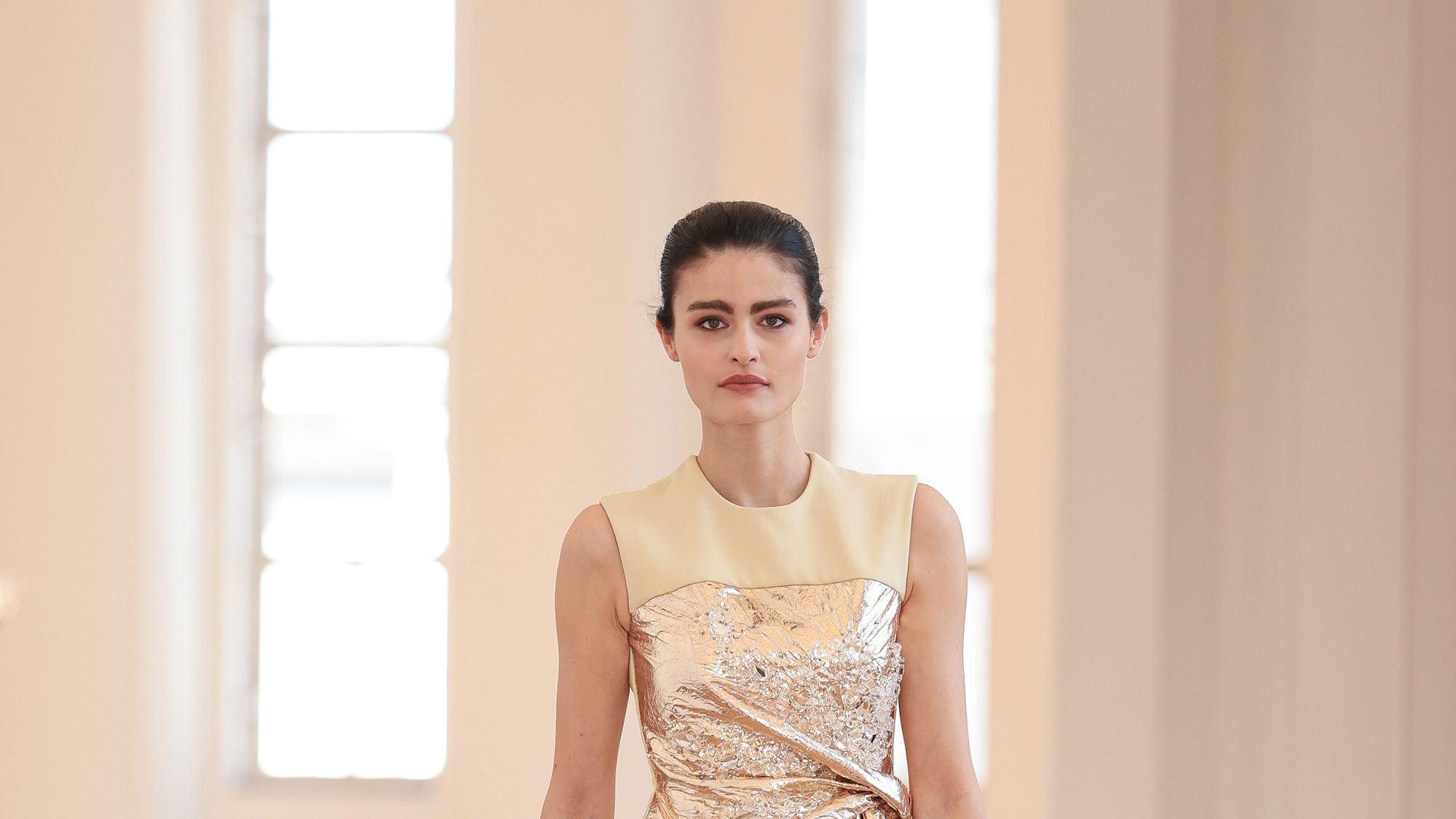 La pasarela, dispuesta con un aire de elegancia e introspección, se transformó en un lienzo donde los modelos desfilaban con trajes que evocaban la esencia de épocas pasadas fusionadas con un enfoque moderno. Los diseños, adornados con intrincados bordados y tejidos lujosos, contaban historias de artesanía magistral y tradición. Cada prenda parecía llevar consigo un trozo de historia, utilizando texturas y colores que recordaban a museos vibrantes y mercados de artesanías, incitando a los asistentes a pensar en los lugares que inspiran tales creaciones.