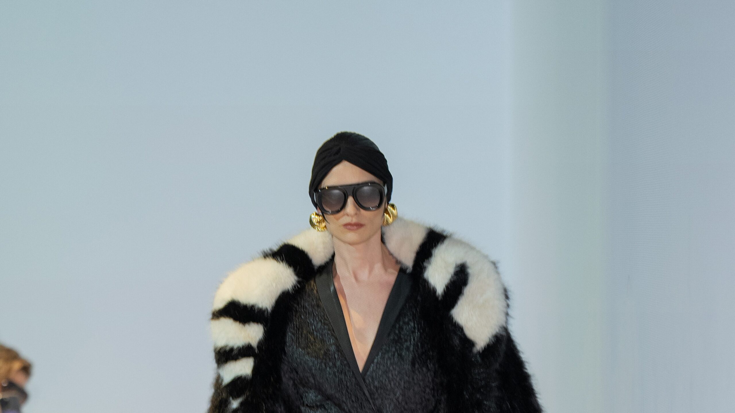 La pasarela se inauguró con un impactante vestido negro, complementado con un voluminoso abrigo de piel sintética, evocando la estética de la "Mob Wife". Esta elección marcó el tono dramático de la colección, que fusiona la sensualidad con la sofisticación.
