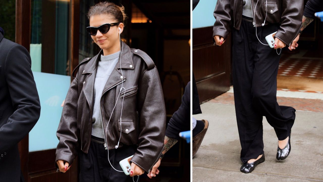 Cómo llevar zapatos planos tabi con pantalones negros como Zendaya en primavera 2025