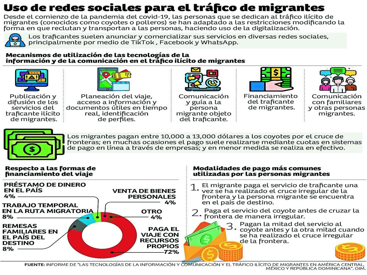 La plataforma de Tik Tok es utilizada con fines de promoción de los “servicios” de las personas traficantes a través de movies cortos, donde muestran “casos exitosos” de cruces irregulares e imágenes atractivas para captar la atención de personas buscando migrar irregularmente con el apoyo de un tercero, señala el documento presentado a inicios de febrero en Costa Rica.