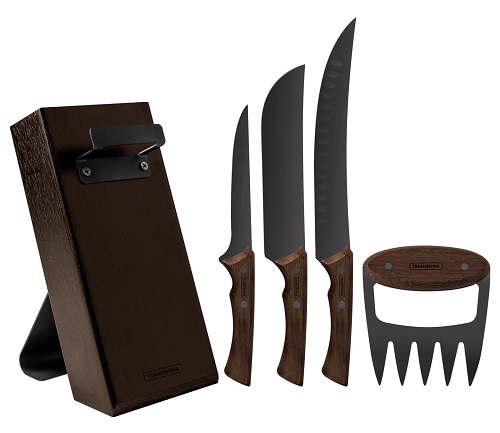 Y para preparar, cortar y servir, cortes, hamburguesas o alitas, el Kit para Asado Tramontina Churrasco Black con Acero Inox Oscurecido y Mangos de Madera (05 pzas) con sus tres cuchillos en acero inoxidable oscurecido para realizar varias funciones y una garra multiusos, garantiza más practicidad y versatilidad. Cuentan con un diseño anatómico y disponen de mangos de madera y remaches de acero inoxidable oscurecido para que su uso sea mucho más firme y confortable. Además de que son resistentes, durables y vienen con soporte de madera que asegura mayor organización y funcionalidad a la hora de guardarlos.