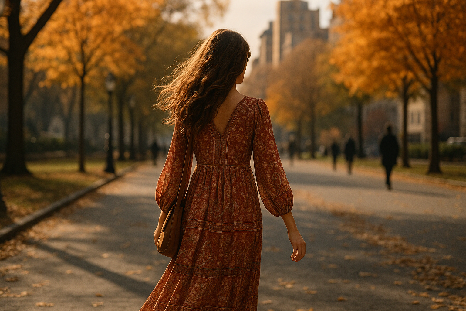 El vestido, confeccionado en un tejido ligero y fluido, se caracteriza por sus detalles meticulosamente elaborados, incorporando elementos de la artesanía tradicional. Las mangas amplias y los bordados delicados crean una silueta que realza la figura de la artista, ofreciendo al mismo tiempo comodidad y sofisticación. La elección del color marrón, un tono que resuena con las paletas naturales del otoño, refuerza la conexión con la tierra y la calidez que se busca en la moda durante esta temporada.