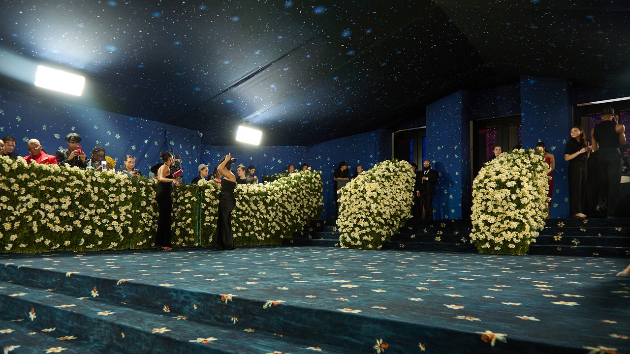 La alfombra roja, diseñada por el artista Cy Gavin, presentó un fondo azul medianoche adornado con flores de narciso en blanco y amarillo, simbolizando la llegada de la nueva temporada y la autoaprecio, en consonancia con la temática de la gala.