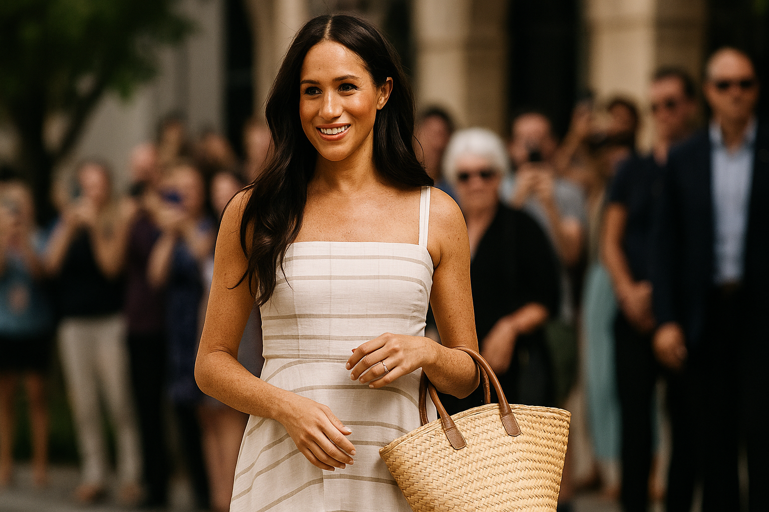Los detalles nunca deben subestimarse. Meghan eligió accesorios que complementan su look sin robar protagonismo. Un par de gafas de sol estilizadas y un bolso de mano con un diseño contemporáneo enmarcan su rostro y acentúan la simplicidad de su atuendo. Este tipo de elección de accesorios no solo muestra un buen gusto innato, sino también un entendimiento profundo de cómo los pequeños toques pueden elevar cualquier conjunto.
