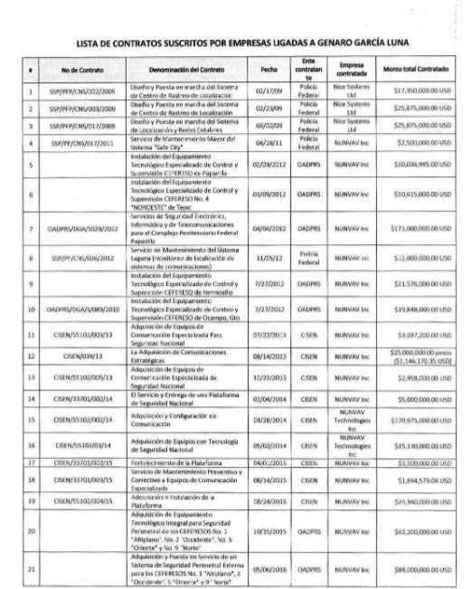 Las empresas implicadas en las 30 contrataciones fueron: Good Programs, Ltd; NUNVAV, Inc; NUNVAV Applied sciences, Inc; GLAC. Los contratos fueron asignados en el sexenio de Felipe Calderón desde la Policía Federal, Órgano Administrativo Desconcentrado Prevención y Readaptación Social; y en el sexenio de Enrique Peña, del Cisen, del Órgano Administrativo Desconcentrado Prevención y Readaptación Social; además, desde el gobierno capitalino en la época de Miguel Ángel Mancera, específicamente a través de la entonces Procuraduría Common de Justicia de la Ciudad de México.
