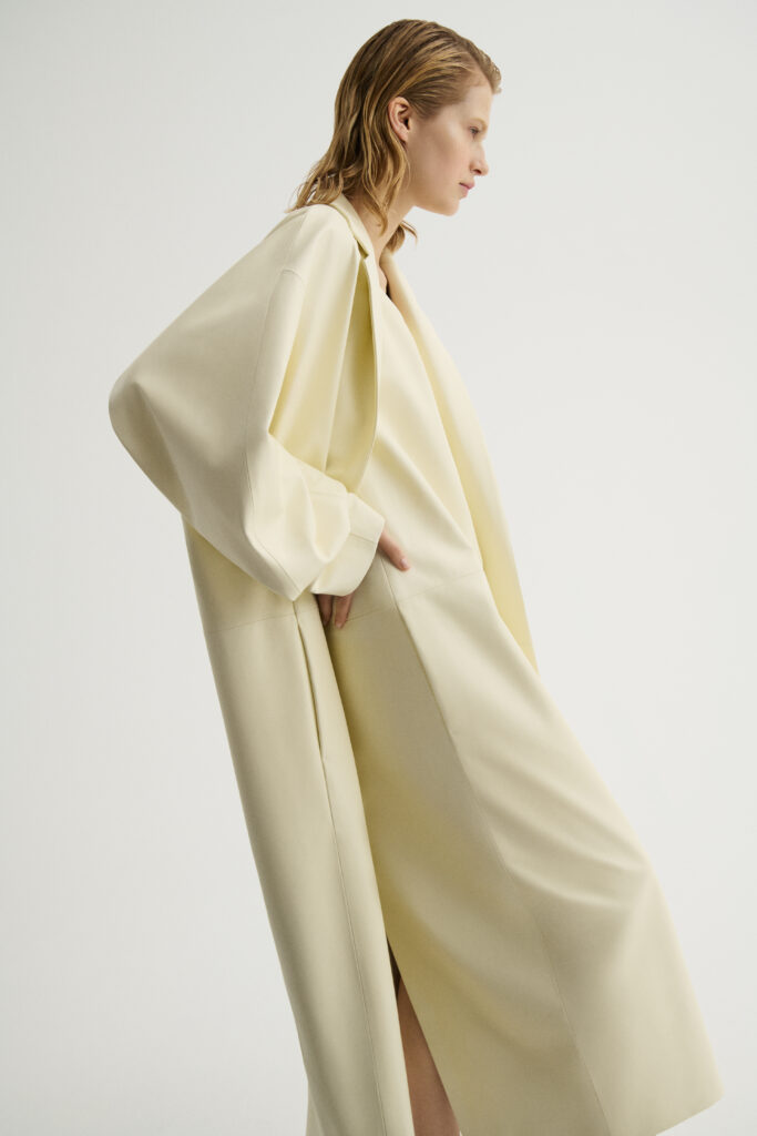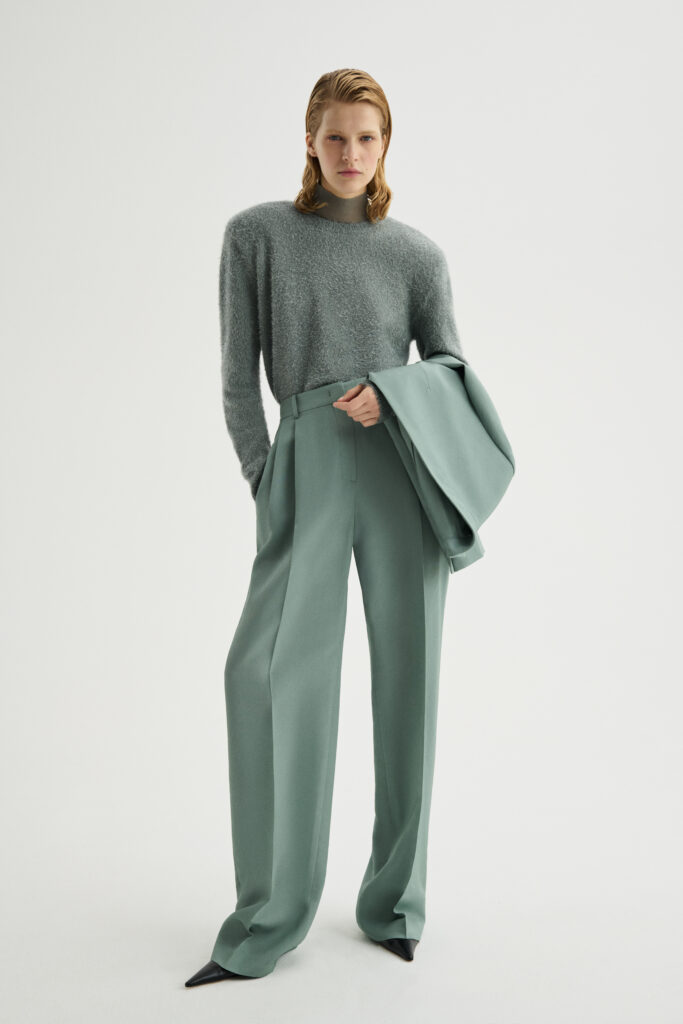 There are no bags in this collection — instead, the focus is on the iconic Andi coat, shown carried in the models’ hands as a symbol of GIADA’s timeless style. This season, the coat features a higher front slit, blending strict tailoring with transparency and softness. The looks are completed with pointed knit ankle boots or fringed slides, balancing structure and ease — a new step toward a more refined kind of beauty.