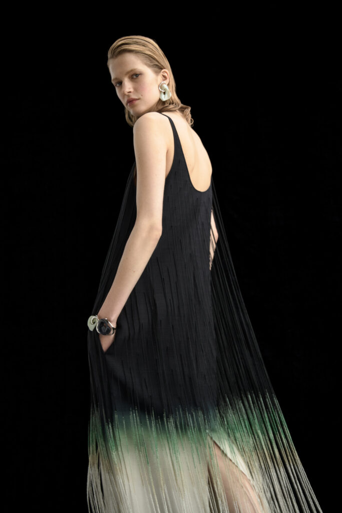 Soft fringes move like delicate threads shaded in black and green, finished with microcrystals. The collection moves between calm and energy, between movement and stillness — much like a garden seen through an artist’s eyes. The textures of the knitwear were inspired by Wendy Golden’s woven baskets, recreated here in viscose and silk mixed with Lycra and metallic threads for a fluid, sculptural effect.