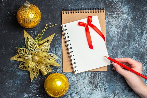 top view xmas tree toys with notepad on light-dark background color christmas new year