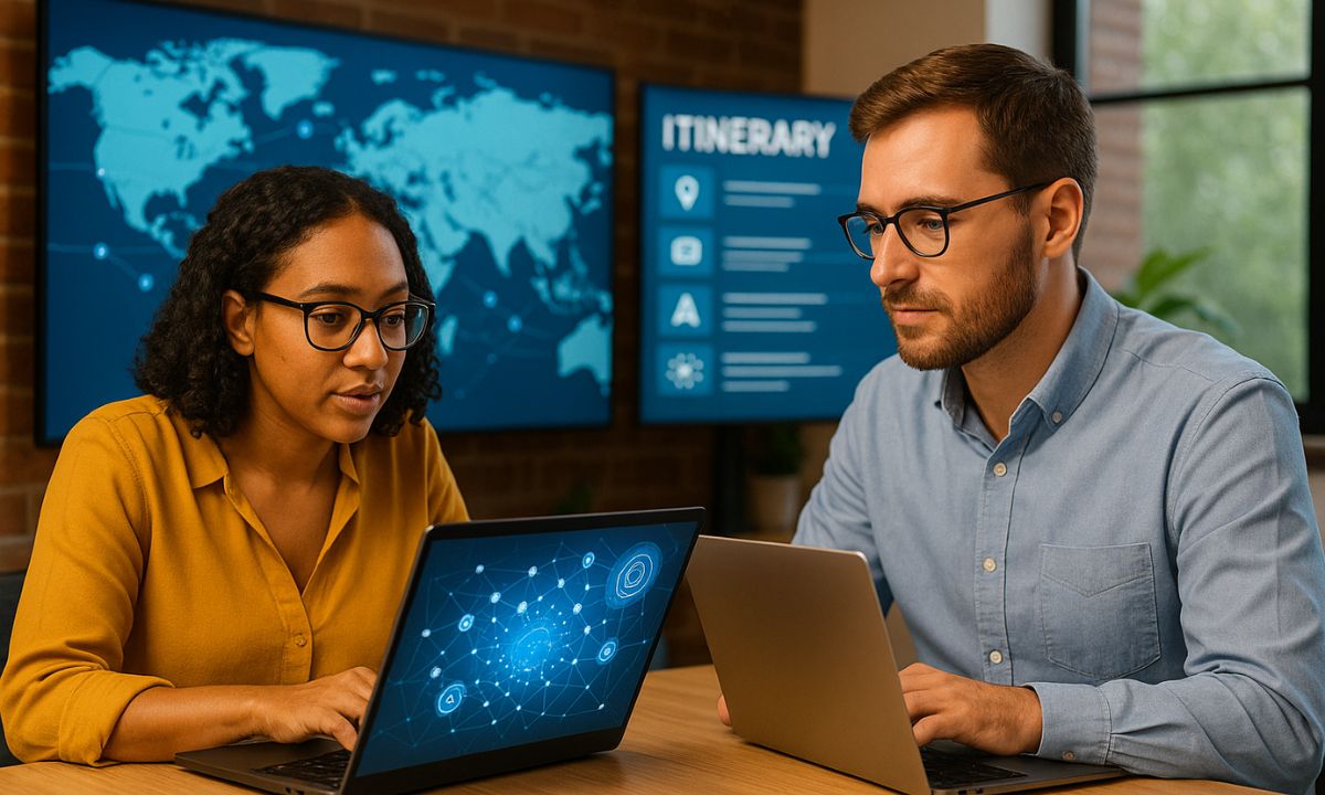 Imagen generada con IA que representa el enfoque digital de Hanaley: dos profesionales colaboran en una oficina moderna de viajes, utilizando laptops con mapas e itinerarios interactivos, simbolizando la combinación de tecnología e innovación en el sector travel.