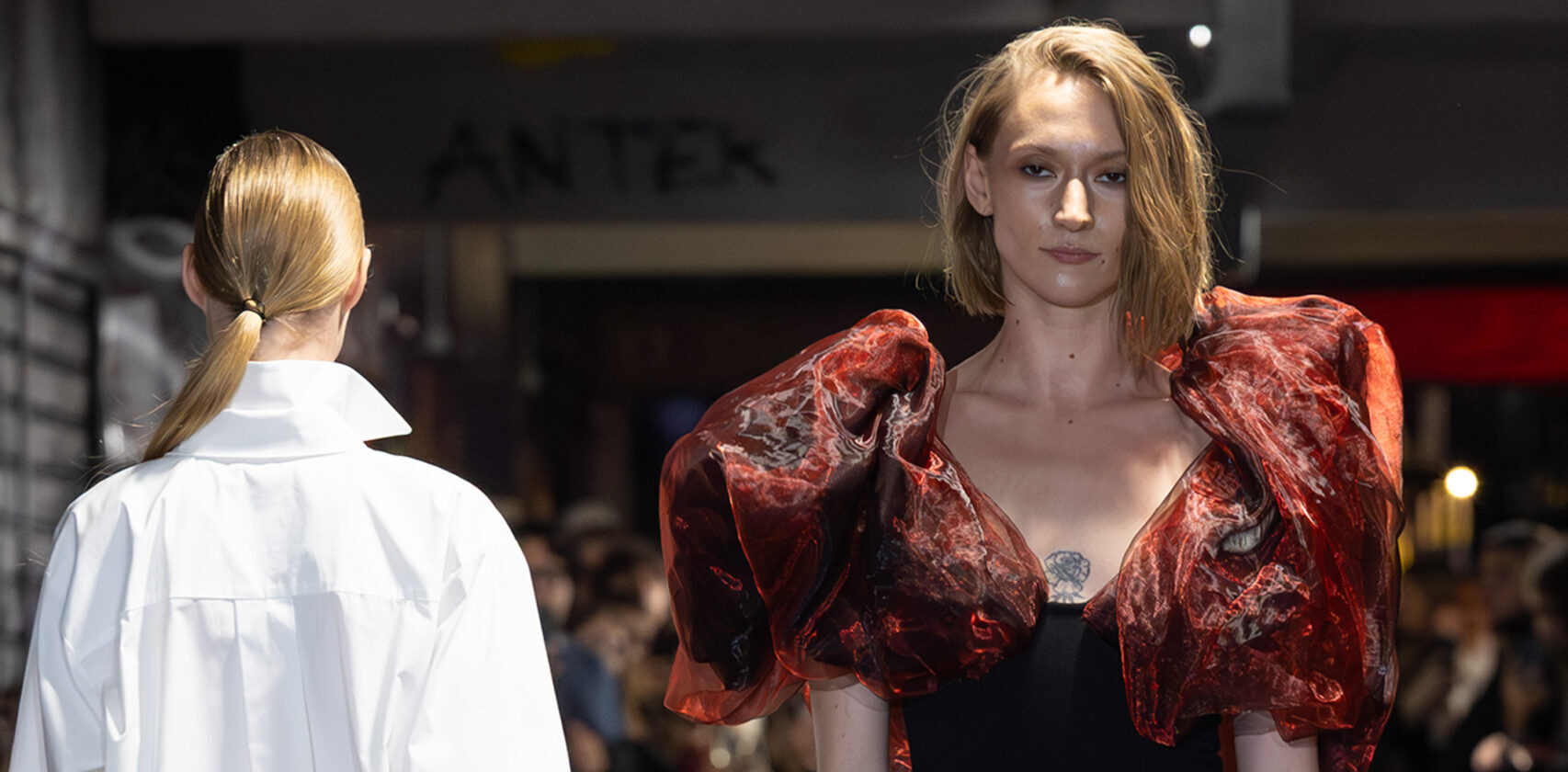Transparency played a central role, with layers of sheer silk voile veiling and revealing in turn — a poetic reflection of vulnerability as strength. Structured elements in virgin wool anchored the looks, balancing the dreamlike movement of lighter fabrics.