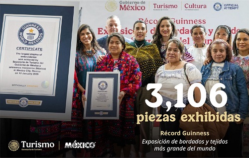 La secretaria de Turismo del Gobierno de México, Josefina Rodríguez Zamora, y la secretaria de Cultura, Claudia Curiel de Icaza, anunciaron que México obtuvo oficialmente el Récord Guinness por la Exposición de Bordados y Tejidos Más Grande del Mundo, tras recibir la certificación internacional que acredita la hazaña cultural y artesanal sin precedentes.