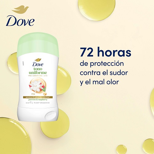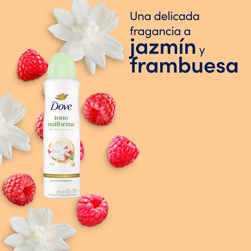 Por ello, Dove eleva la categoría de desodorantes femeninos al integrar ciencia Pro-Ceramida en su línea Dove Tono Uniforme, la cual ayuda a recuperar el tono natural de la piel de las axilas y acompaña a las mujeres con una nueva fragancia sensorial: jasmine raspberry.