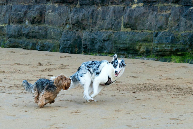 Dos perros juegan en la playa del Rinconn, en Gijn (Asturias).