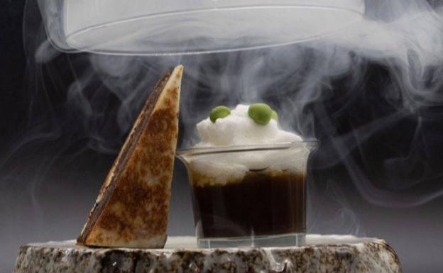 La Olla de la Plaza Nueva ha plasmado la cocina de guisos, rica y un poco más rebuscada utilizando productos y técnicas que nos puede ofrecer la cocina precise. «Es un pintxo de unte y de sabores intensos, haciendo referencia a la importancia de los caldos, fondos y de los productos del día a día», explica.