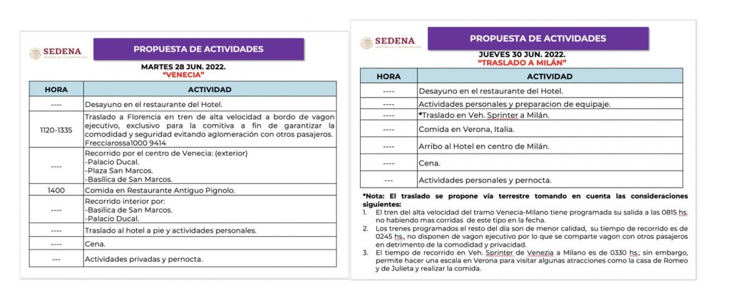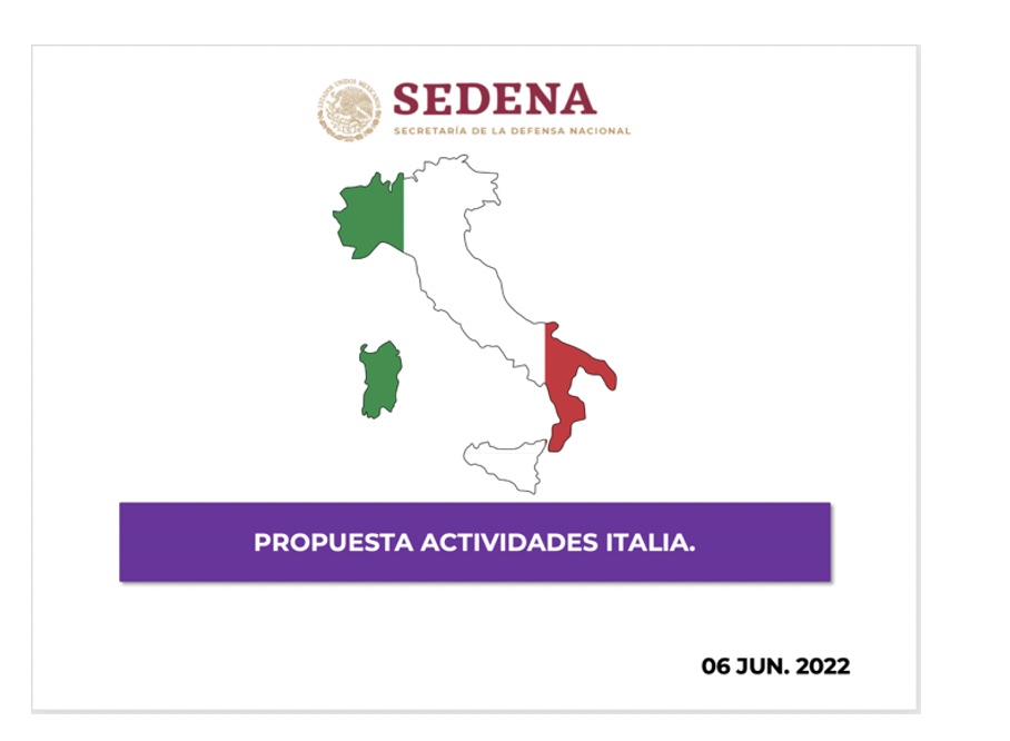 Tanto Vladimir como Sabino se habían esmerado al elaborar la presentación de 27 páginas. La carátula mostraba el emblem oficial de la Sedena, con una representación visible de Italia, el título “Propuesta Actividades Italia” y la fecha.