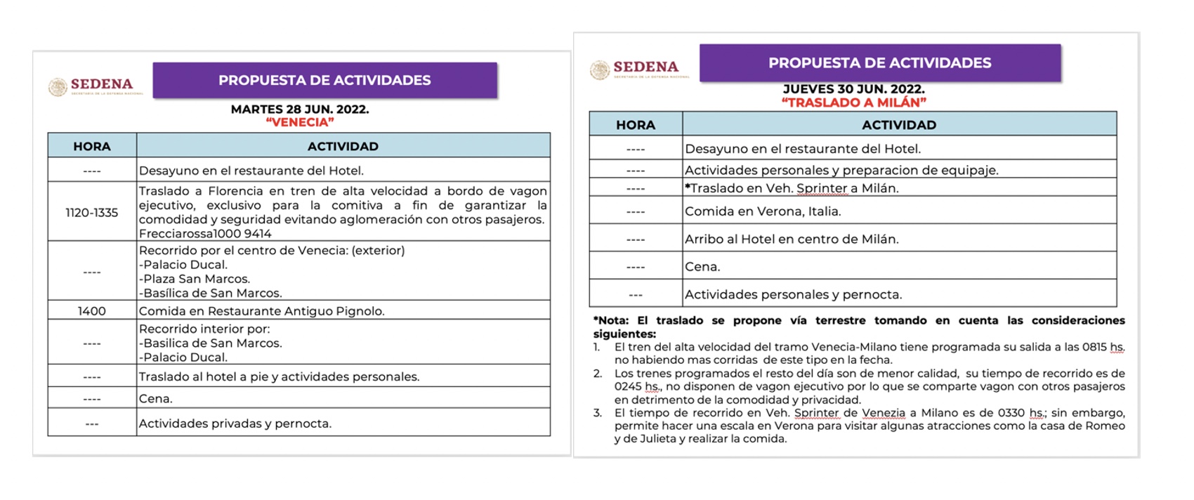 La agenda incluye una estancia de 14 días, de los cuales cinco serán en Roma, tres en Florencia, tres en Venecia y tres en Milán. En el cuadro se enlistan algunas actividades y sitios a visitar en cada una de las ciudades, desde la audiencia papal de los miércoles en la Plaza de San Pedro, el Coliseo y los Foros Imperiales, hasta el Palazzo Vechio, la Torre de Pisa, el Palacio Ducal o el Duomo de Milán.