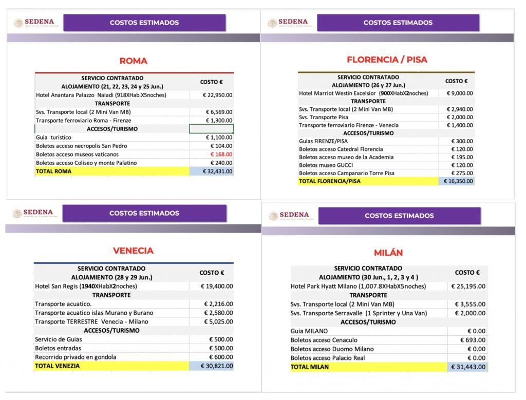 A eso habrá que sumar comidas y el costo de los vuelos de Ciudad de México-París-Roma y Milán-París-Ciudad de México.