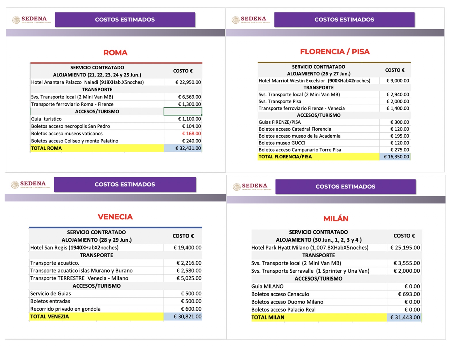 Casi todo se mantuvo como se planteó en la propuesta inicial. Al closing, el presupuesto de la visita acquainted a Italia, sólo por hospedaje y transporte, sin incluir comidas ni compras adicionales, se cerró en 2 millones 431 mil pesos, de los cuales un millón 684 mil correspondieron a los hoteles.