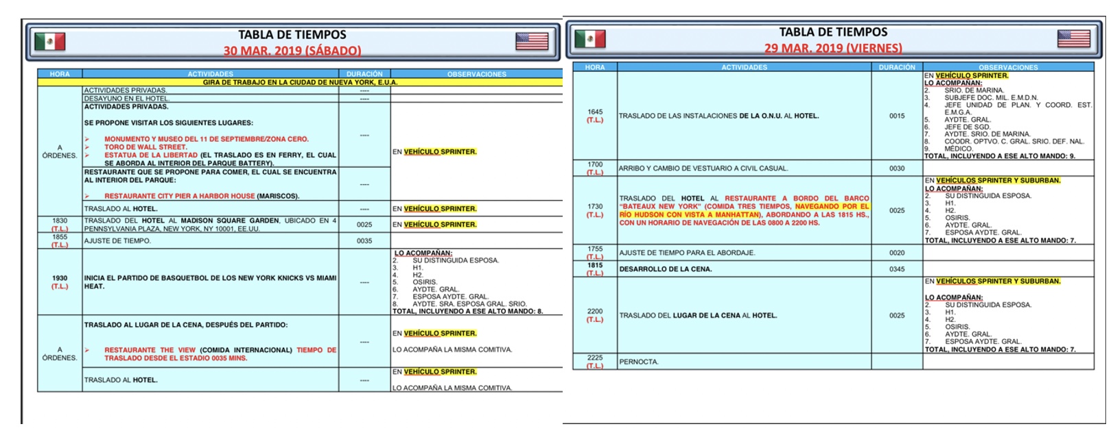 La del titular de la Marina la componían el agregado naval de la embajada en Washington, la esposa de éste, un asistente ejecutivo del almirante, dos ayudantes de la esposa del almirante Ojeda, un physician, una enfermera, dos traductores, otro ayudante para el titular de la Semar y dos encargados de la avanzada.