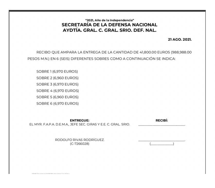En el texto se leía lo siguiente: “Recibo que ampara la entrega de la cantidad de 41,800.00 euros (988,988.00 pesos m.n.) en 6 (seis) diferentes sobres como a continuación se indica: sobre 1 (6,970 euros), sobre 2 (6,960 euros), sobre 3 (6,970 euros), sobre 4 (6,970 euros), sobre 5 (6,960 euros), sobre 6 (6,970 euros)”.