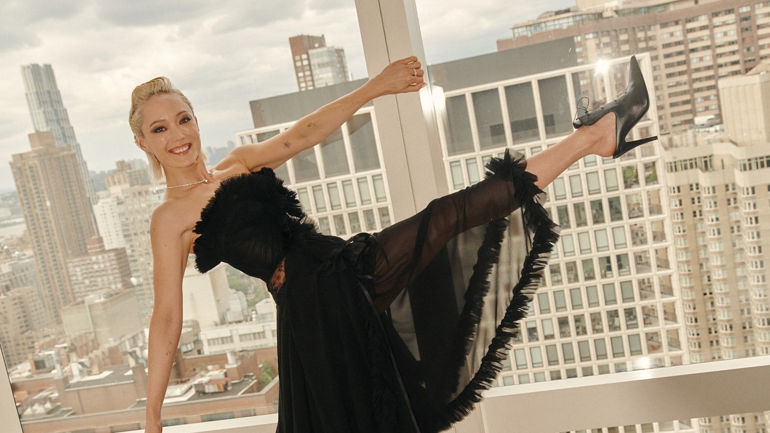 Primero, imaginemos el escenario: una alfombra roja que serpentea bajo las luces deslumbrantes de un evento exclusivo. En este entorno de lujo y entusiasmo, Pom se preparaba para deslumbrar con su presencia y elegancia. La anticipación en el aire era palpable, con fanáticos emocionados reunidos, ansiosos por ver a sus ídolos.
