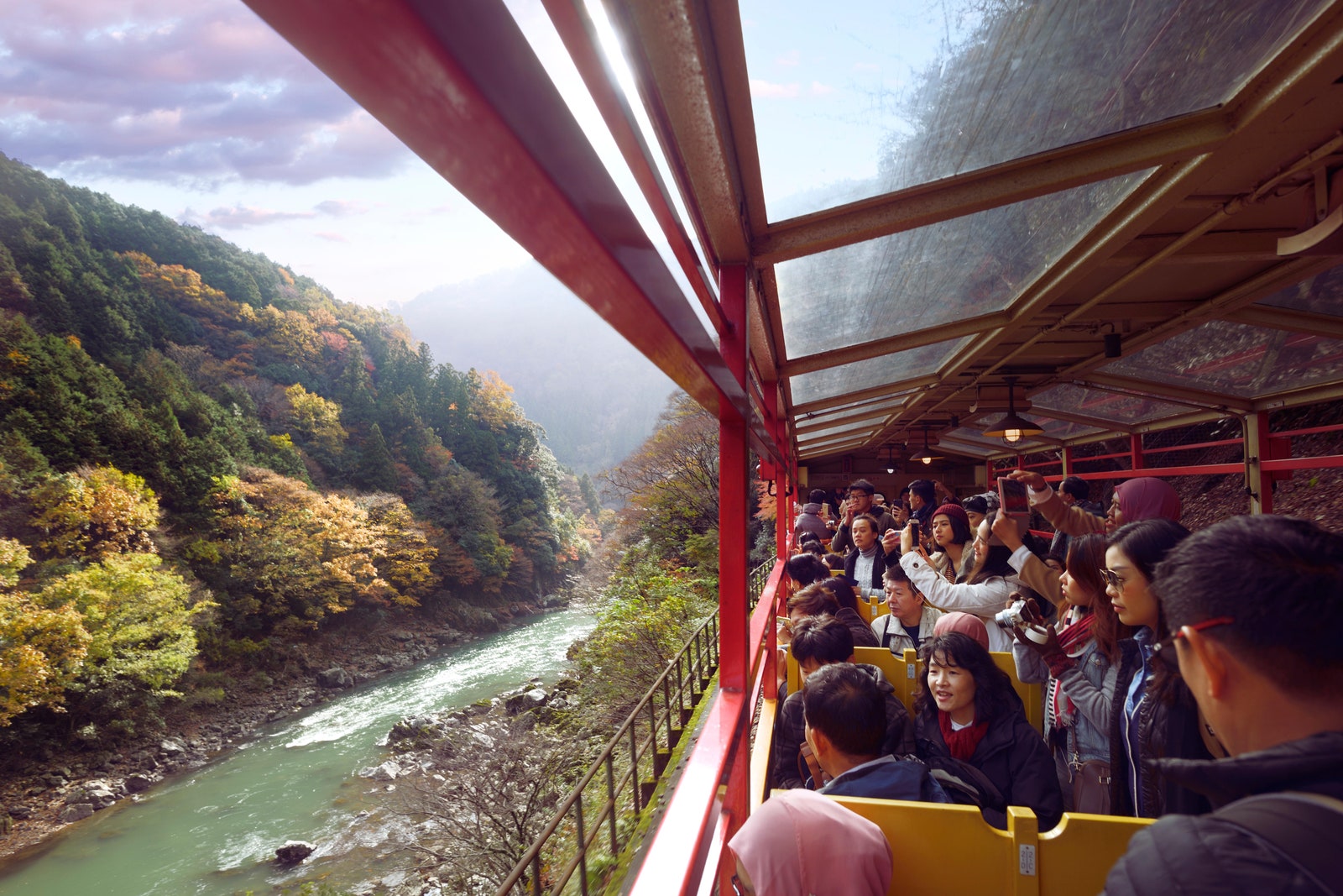 Vistas del desfiladero de Hozukyo desde el coche abierto del tren turístico de Sagano en Kyoto Japón