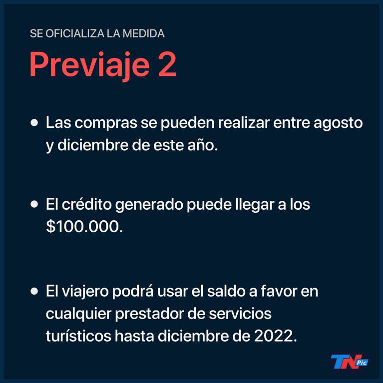 La precompra se podrá realizar entre agosto y diciembre de este año. Están incluidas agencias de viaje, alojamiento, transporte y otros servicios turísticos como centros de esquí, bodegas, alquiler de vehículos y espectáculos artísticos. El crédito otorgado se podrá utilizar en comercios de toda la cadena turística del país desde noviembre 2021 hasta diciembre de 2022.