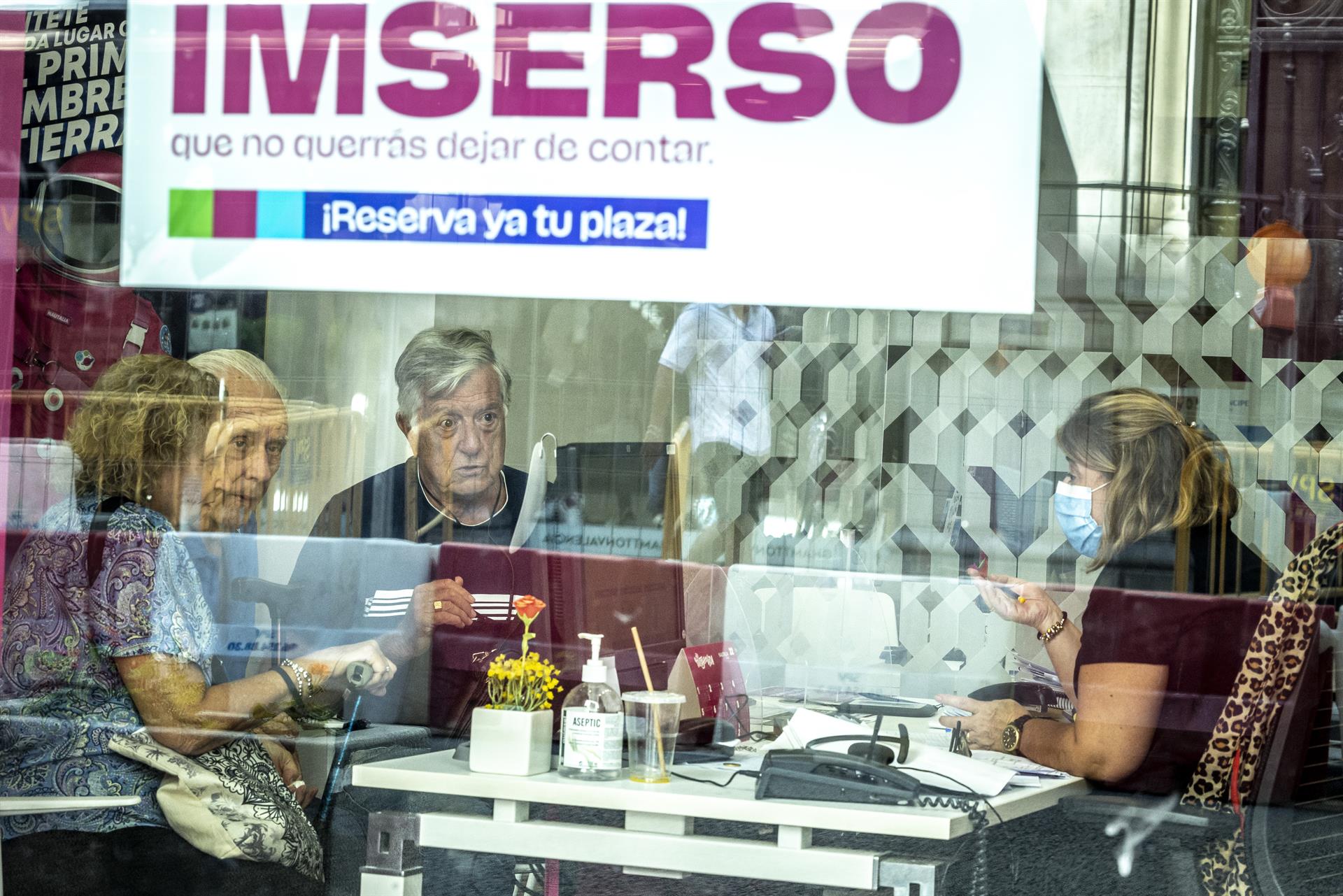 Varias personas mayores piden información en una agencia de viajes adherida al programa del Imserso.