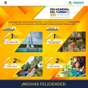 La Segunda edición de la Convocatoria Premio a la Innovación y Diversificación Turística en el Caribe Mexicano 2021 fue lanzada el pasado 27 de septiembre en el marco del Día Mundial del Turismo, dicha convocatoria surge del Plan para el Turismo Sustentable Quintana Roo 2030, el cual se alinea a los Objetivos de Desarrollo Sostenible de la ONU para lograr niveles más elevados de productividad económica mediante la diversificación, la modernización tecnológica, la innovación y la sustentabilidad.