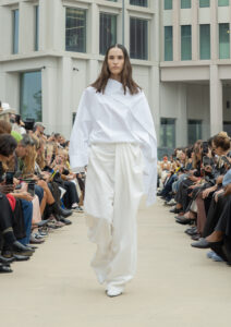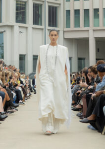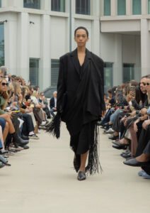 Throughout the collection, there was this recurring theme of lightness—everything seemed to move effortlessly. The silhouettes were loose yet protective, creating this balance between comfort and elegance. Even the trousers were unique. They weren’t tailored in the traditional sense—no pockets or seams—but draped naturally, almost as if they formed on the body, giving off a vibe reminiscent of Josephine Baker’s fluid style.