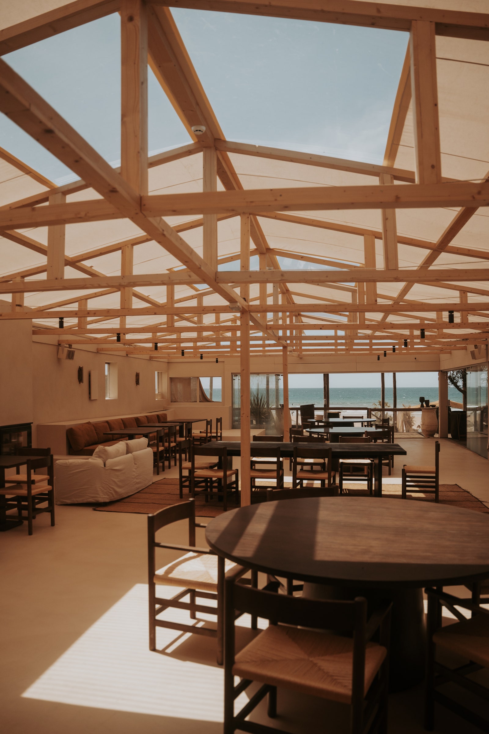 Mesas de madera, sillas con respaldo de lona, toldos de arpillera, alfombras de yute, suelos de microcemento, cojines con tejidos naturales y un sinfín de piezas de cerámica componen este restaurante dividido en varios espacios. El interiorismo de Juliana Cavalcanti destaca por sus muebles y piezas a medida, fabricados a mano por artesanos tradicionales, y una estética atlántica (pero con toques mediterráneos). Además, la madera es protagonista en todos los rincones: desde la madera de iroko de las secciones exteriores hasta la madera de fresno de varias piezas del comedor inside, ambas procedentes de Europa.