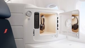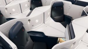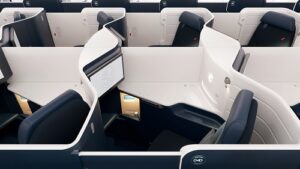 El diseño de este asiento se basa, por sus siglas en inglés, en las “3 F”: Full Flat, lo que significa que el asiento se transforma en una cama de casi dos metros de largo, Full Access, para brindar a todos los pasajeros acceso directo al pasillo, y Full Privacy, para garantizar una privacidad óptima. Una nueva puerta corrediza permite a los pasajeros crear un espacio totalmente privado, fuera de la vista de otros pasajeros. Para mayor sensación de privacidad de los pasajeros que viajan juntos, los asientos ubicados en el centro de la cabina ahora están equipados con un panel central que baja presionándolo, creando así un espacio de convivencia durante un vuelo compartido. El asiento también cuenta con una amplia pantalla que no deslumbra, con resolución de alta definición 4k y 43.94 centímetros, además de auriculares que reducen el ruido, una nueva conexión Bluetooth que permite a los pasajeros usar sus propios auriculares y varios puertos de conexión.