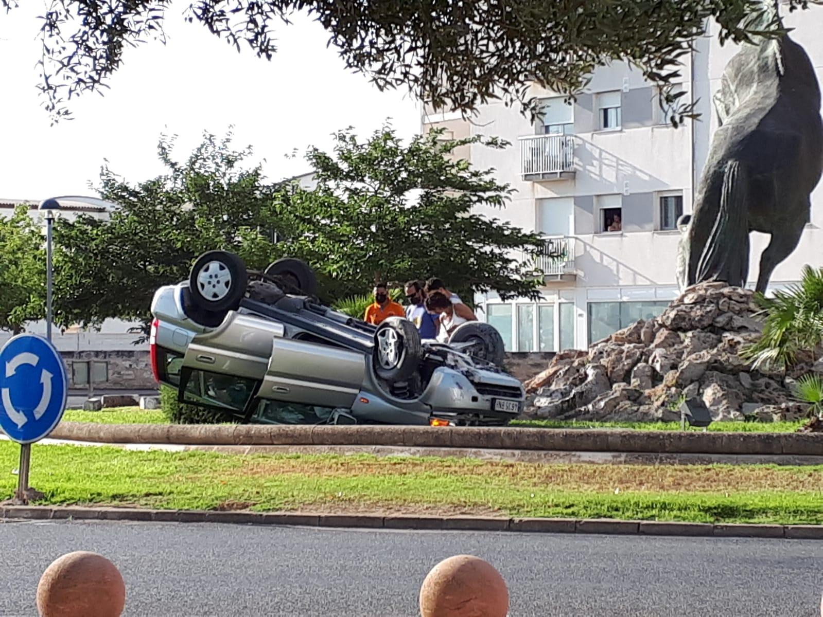 La mujer herida es la conductora y única ocupante del vehículo . Por causas que se desconocen la conductora, que venía de la carretera, no ha hecho la rotonda de acceso y ha acabado encima de la glorieta con el coche volcado.